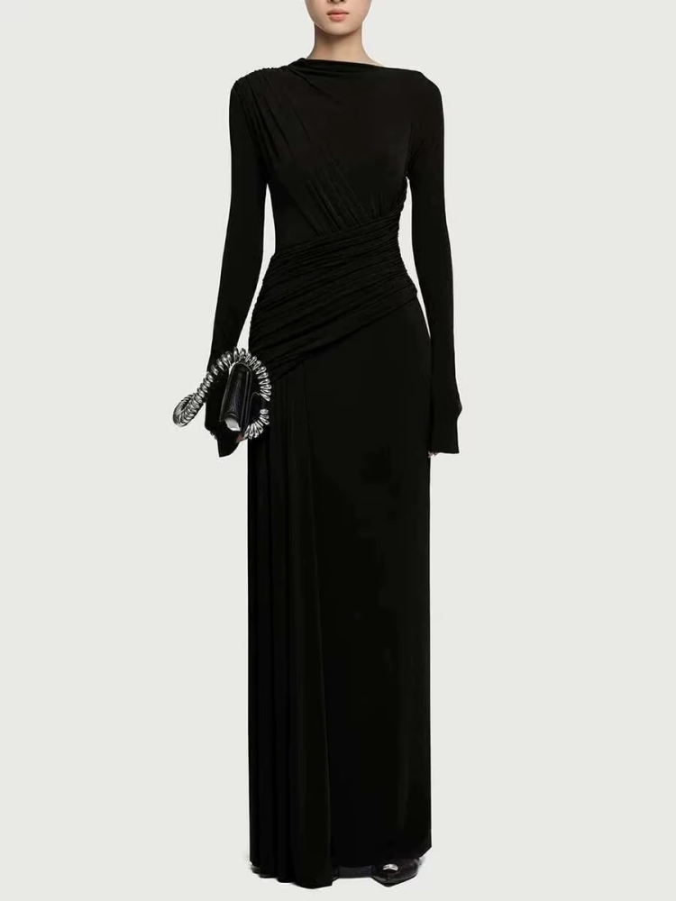 - أكمام طويلة تضيف لمسة كلاسيكية وتكمل أناقة الفستان الطويل.